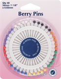 Nickel plated steel Berry pins with colourful decorative plastic heads. Neatly stored in a traditional pin wheel. 0.65mm, 40 pieces.